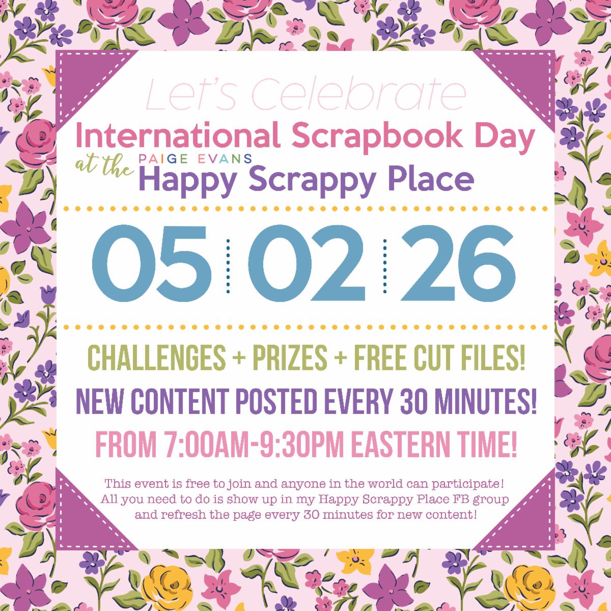 It's that time of year again! Let's celebrate International Scrapbook Day 2026 in my Happy Scrappy Place Facebook Group!! This event is FREE to join and anyone in the world can participate - all you need to do is show up on Saturday May 2nd 2026 from 7am-9:30pm Eastern Time and refresh the page every 30 minutes for new content! There will be 12 challenges from me and my amazing Design Team with prizes, 12 free cut files, 2 giveaways, and I'm planning to go LIVE to create a layout together! Save the date of MAY 2ND and I can't wait to have a happy scrappy day together celebrating scrapbooking!